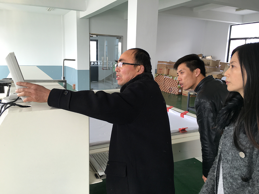 演示過程中,李總不斷的詢問技術和功能,鼎諾機電的工作人員熱情耐心的為李總解答問題。鼎諾機電專注于生產高性價比的家紡設備,成組的生產線設備,正是?李總尋求的。