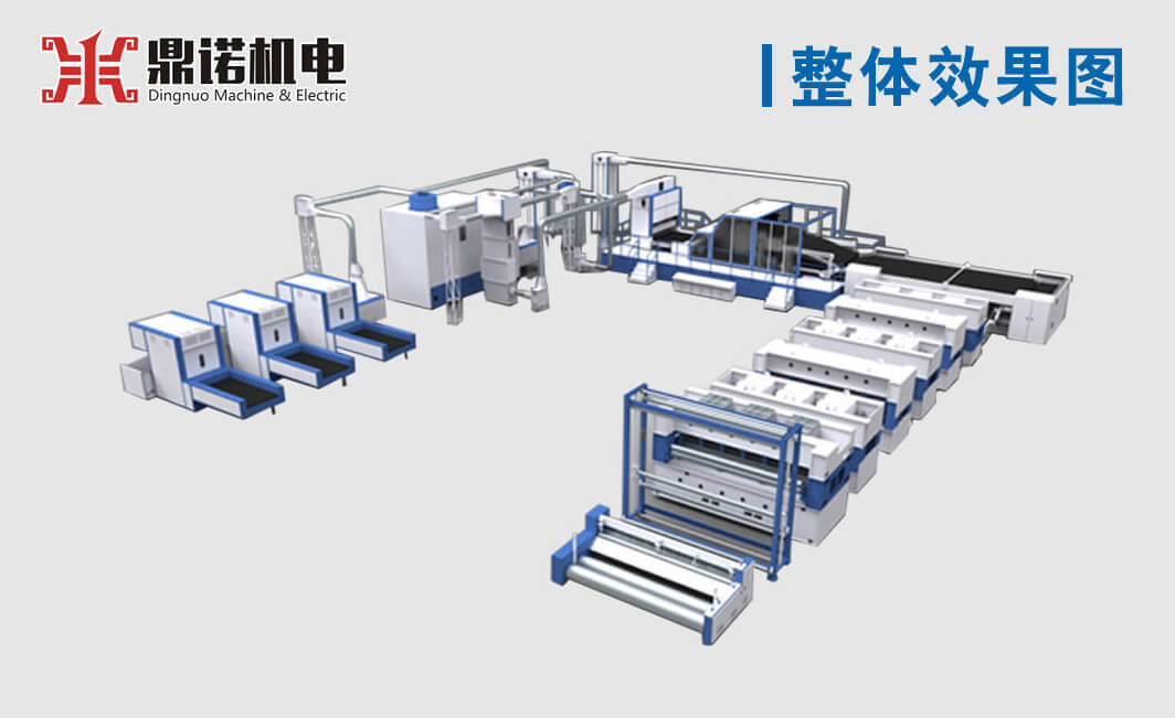 玻璃纖維針刺氈生產線以玻璃纖維為原料,用刺針對梳理后的短切玻纖氈進行針刺,用機械方法使氈層玻纖與增強玻纖基布之間纖維相互纏結,纖網得以加固而制成的氈狀非織造布材料。具體配置如下: