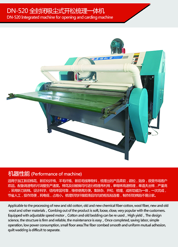 開松梳理一體機,集除雜、開松、疏松、成型功能為一體,一次完成,節省人工,操作簡便,耗電低,占地小。疏松好的纖維順滑且均勻的相互粘連著,制作好的棉胎不易分家。